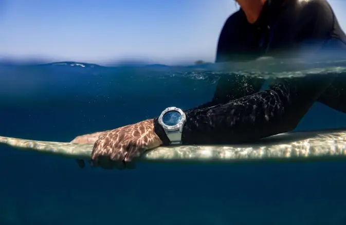 - Calificación de resistencia al agua 5 ATM (soporta la presión de estar sumergido a 50 metros de profundidad), una buena opción para nadar a poca profundidad o hacer surf.
