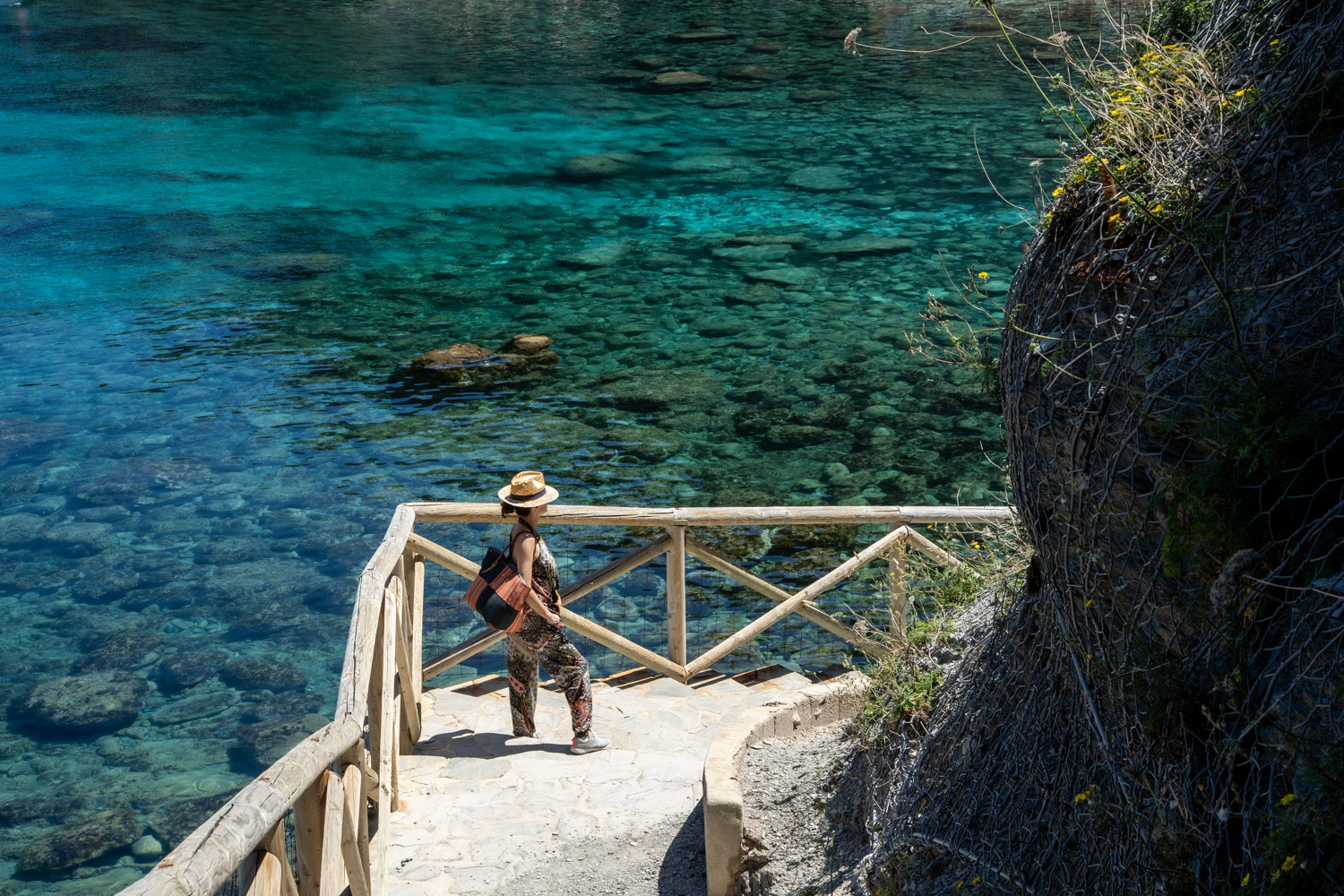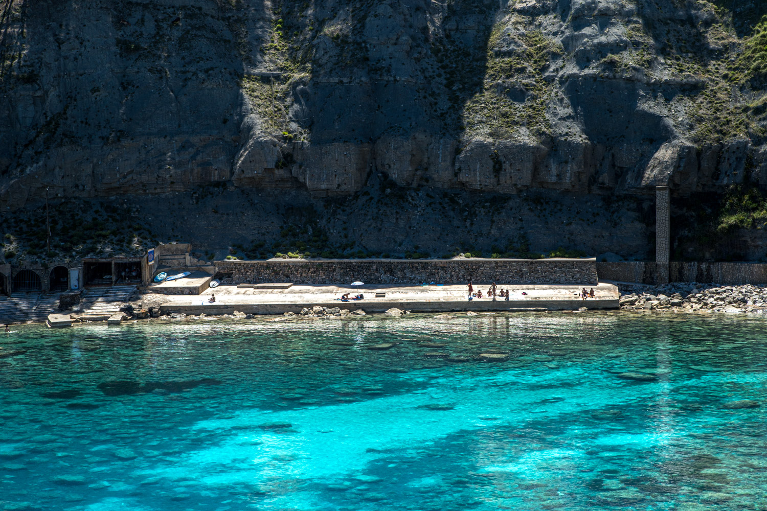 Una escalinata con barandilla de madera lleva a los bañistas hasta la playa, donde el reflejo del sol en las paredes verticales proporciona a Cala Banyalbufar una tonalidad única en el mundo. Este fenómeno es común en las calas del norte de Mallorca, y es uno de los muchos motivos por los que esta cala es un lugar tan especial para el buceo y la exploración submarina.