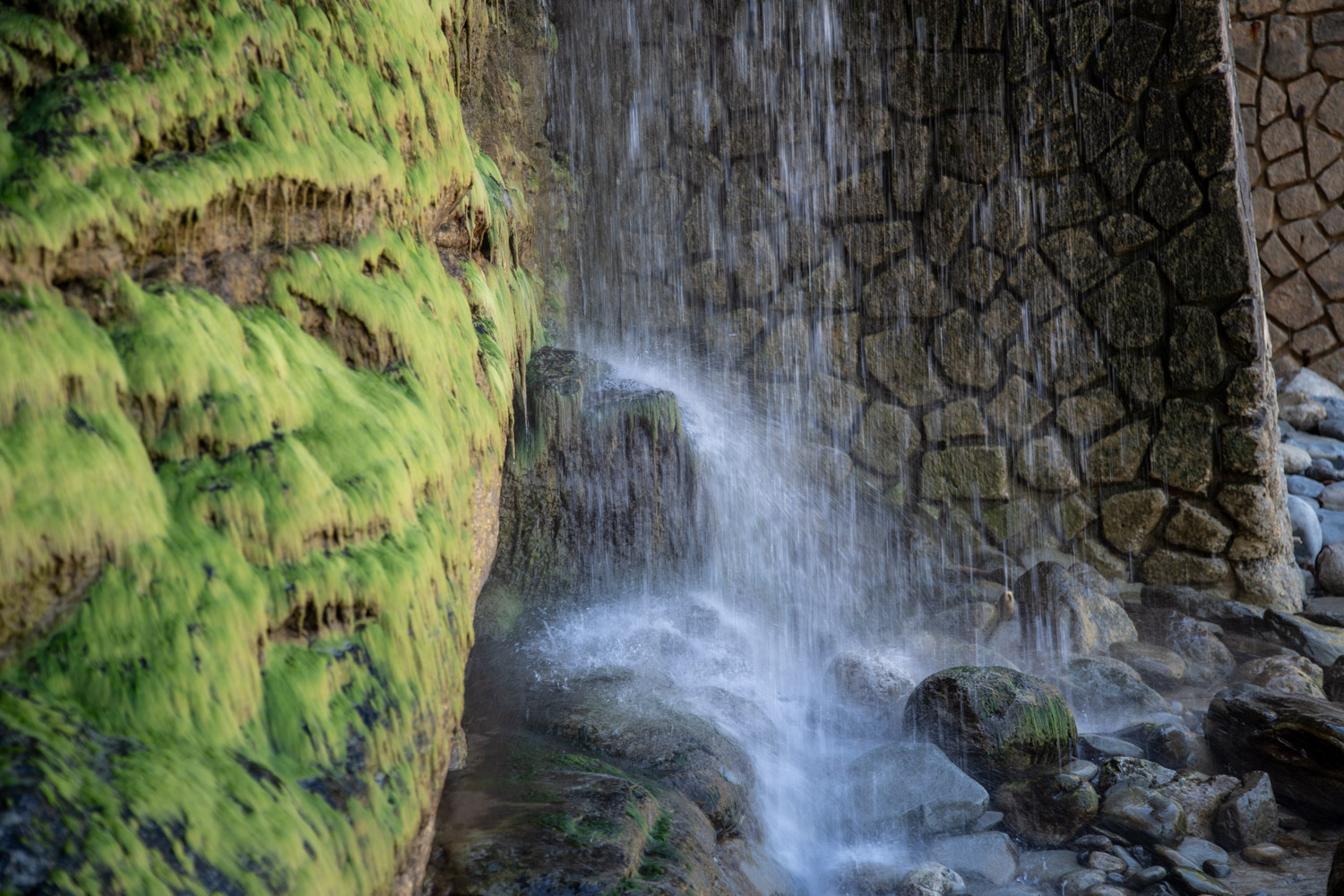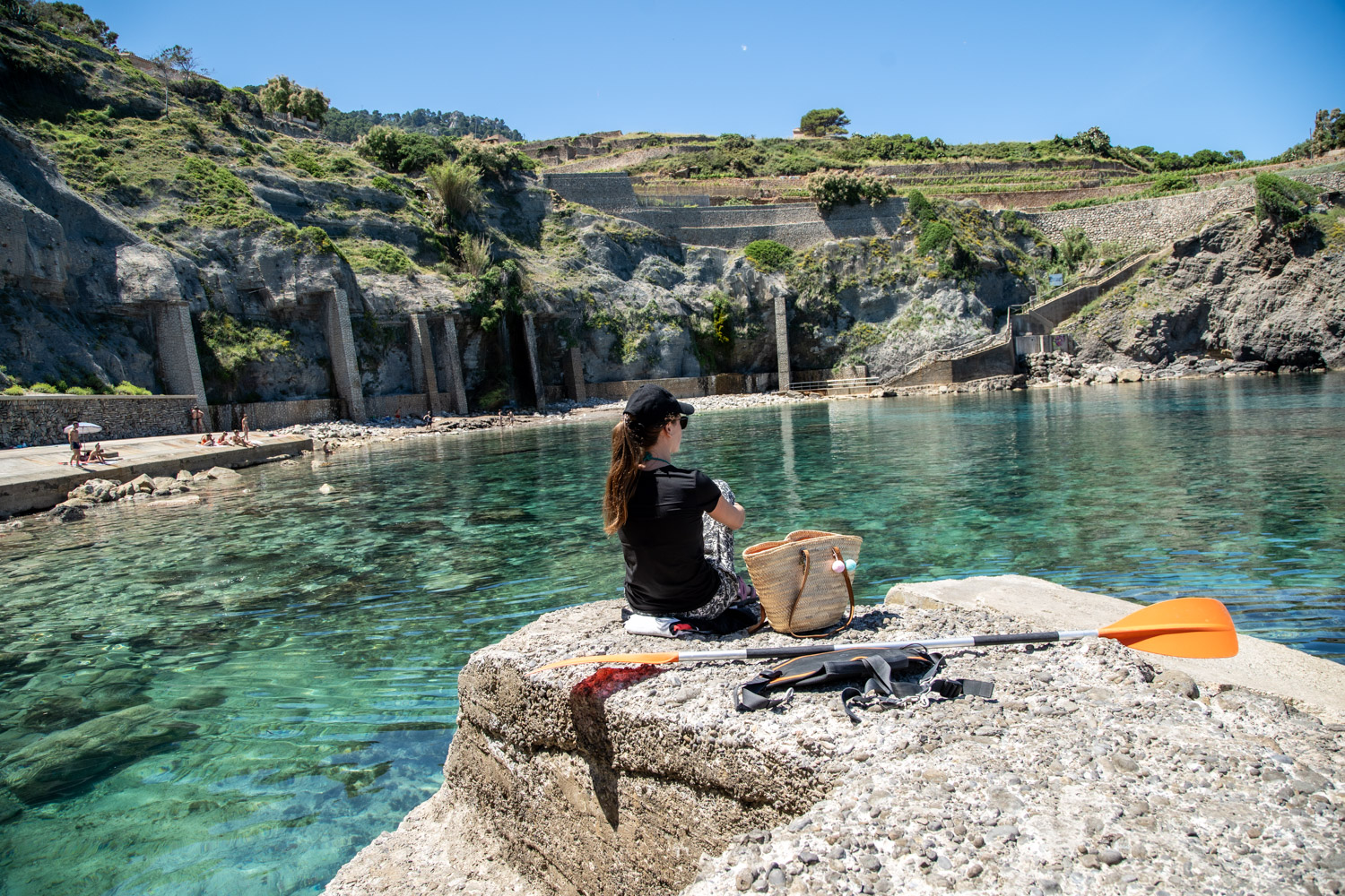 El ambiente en Cala Banyalbufar es de pura tranquilidad y conexión con la naturaleza. Una carcajada se camufla entre el repiqueteo del agua de la cascada contra las rocas. Un grupo de chicas toma el sol en la pequeña explanada de hormigón que separa el acantilado del agua, disfrutando del entorno y la serenidad del lugar.