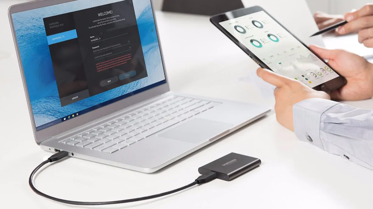 Gracias a la ausencia de partes móviles y a su construcción a prueba de golpes el T5 puede soportar caídas accidentales de hasta 2 metros. El software Samsung Portable SSD para PC y Mac utiliza el cifrado de datos por hardware AES (Advanced Encryption Standard) con claves de 256 bits y facilita la configuración de los ajustes de seguridad y la recepción de las últimas actualizaciones del firmware del disco y del software. También hay disponible una aplicación móvil para smartphones y tablets Android que permite gestionar el funcionamiento de la unidad portátil. El T5 incluye dos cables de conexión USB -de Tipo-C a C y de Tipo-C a A-, haciendo que la unidad sea compatible con un gran número de ordenadores y dispositivos.